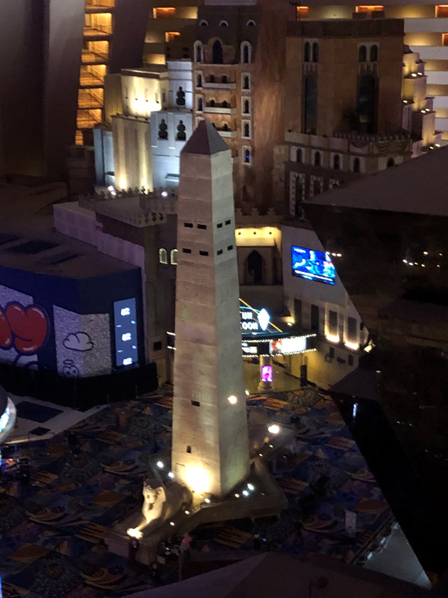 After a quick cab ride, I checked into the Luxor. My room was on the 15th floor facing east at Harry Reid, not him but the airport, and west to the innards of the hotel. The ride up the elevator to my floor was weird. The elevator does not go up or down at a 90-degree angle from floor to floor. It travels up and sideways at a 39-degree angle, and has been named the inclinator. The sensation of going up and sideways at the same time is one of WTF at first, followed by “that’s different.”