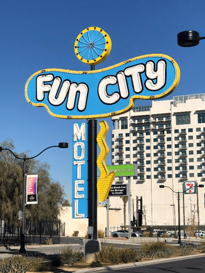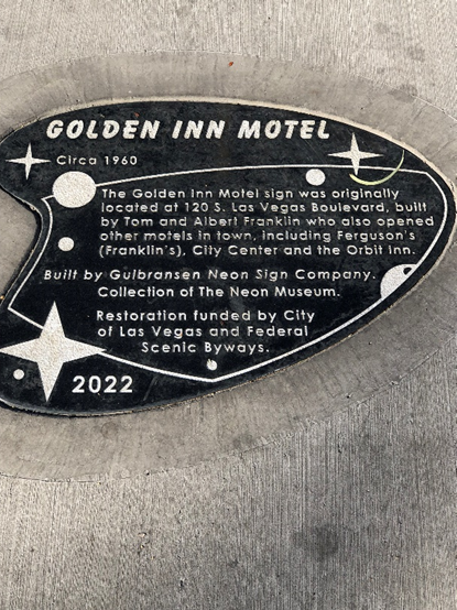 The most interesting part of the trek started at Sahara Avenue. Soon, I found myself at the real Las Vegas, not Paradise, the part of town where the Federal and State buildings are found. There is a welcome sign, then another, followed by a large collection of wedding chapels, including a drive-through operation. The real treat up there can be found in the median of Las Vegas Boulevard. With the goal of celebrating its history, the city of Las Vegas has moved a number of hotel and casino signs to the median, offering a stone in the sidewalk that briefly describes the history of a particular place. I had a great time taking photos of all the signs that I saw.