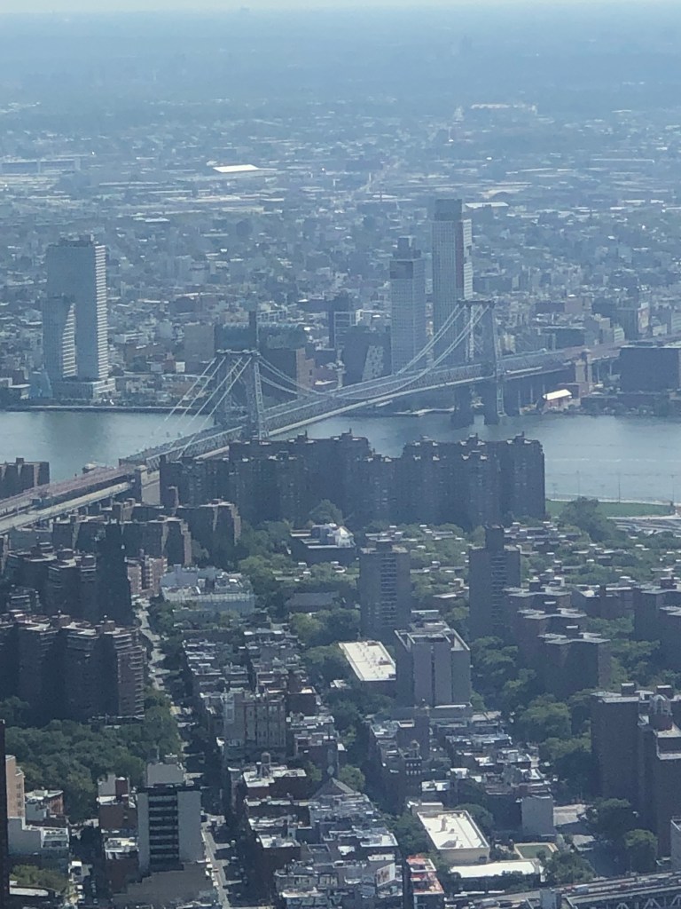 We’ve been to NYC many times since the completion of the World Trade Center (WTC) and the memorials around it. For reasons that I can’t fully explain, I have avoided a trip to this part of Manhattan. Perhaps the scenes from that day or the stories that I have heard since, some from my cousins, have kept me away. Anyway, it was time to go and at Janet’s urging we decided to take the 45-second elevator ride to the observation deck of the WTC. Only there, or any other place with some altitude, can you get the full monty of NYC, its tall buildings, bridges, rivers, parks, and islands.