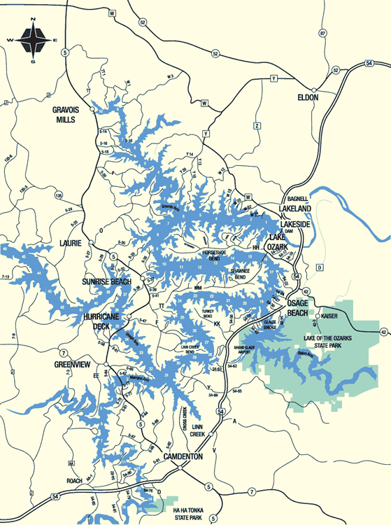Lake of the Ozarks was created in 1931. The Osage River was dammed (Bagnell Dam), eventually creating a 55,000-acre lake with 1,150 miles of shoreline (more shoreline than the state of California). The dam is used to generate electricity and the lake is quite popular for fishing, boating, skiing, and other lake-related activities. It’s an odd-shaped lake in that there is no one large pool of water. Instead, there is a network of smaller bodies of water linked together to form a winding path of water which covers 92 miles.