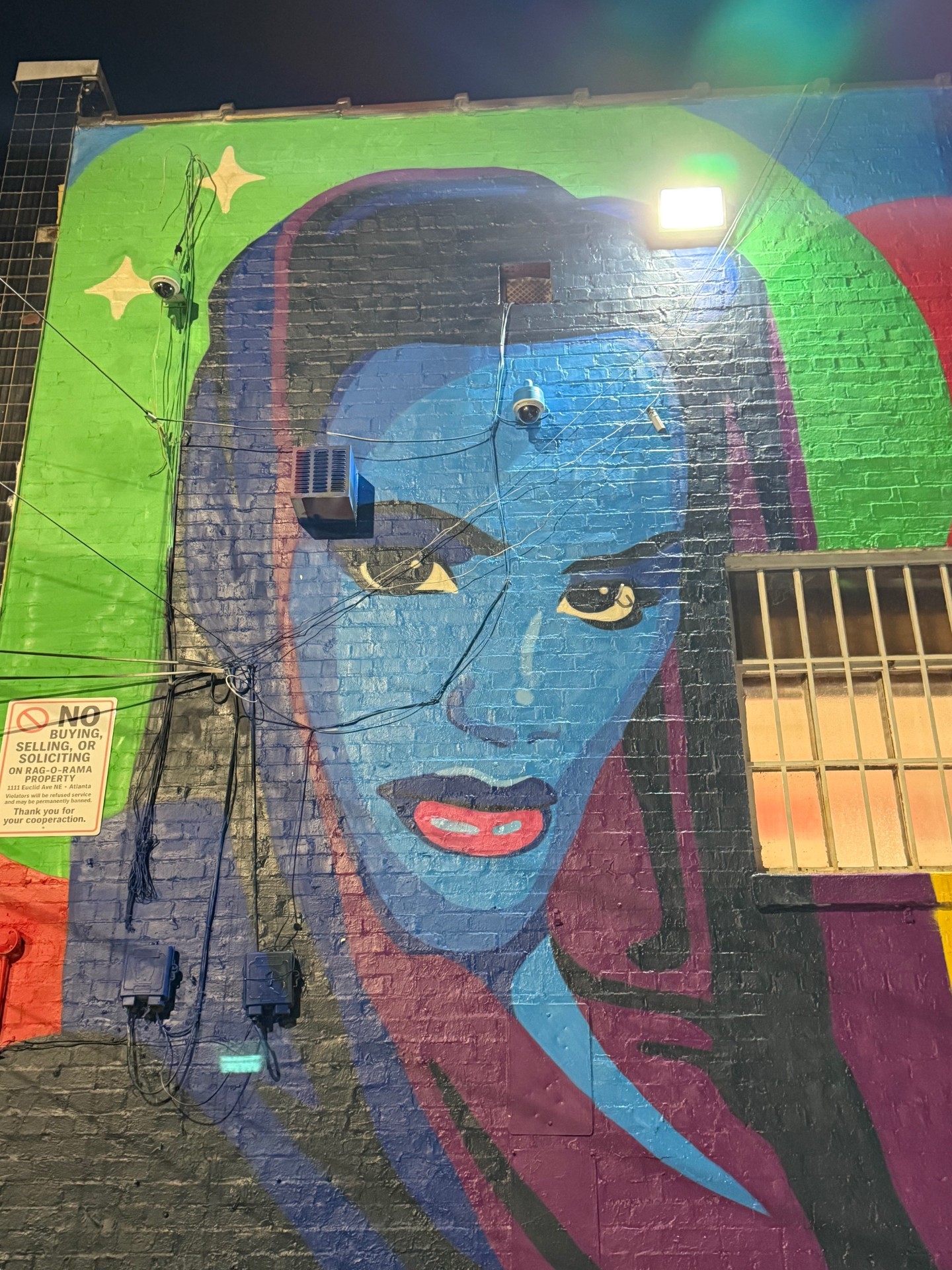 Janet has become an expert at choosing very cool Airbnbs for our travels both here in the U.S. and internationally. This time it was in the Meadow Lake historical area of Atlanta. Our house was amazing: 100 plus years old, yet redone in a way to make it interesting and fun. The other houses in the neighborhood were full-tilt holiday and the commercial collections were lively and marked by interesting murals.