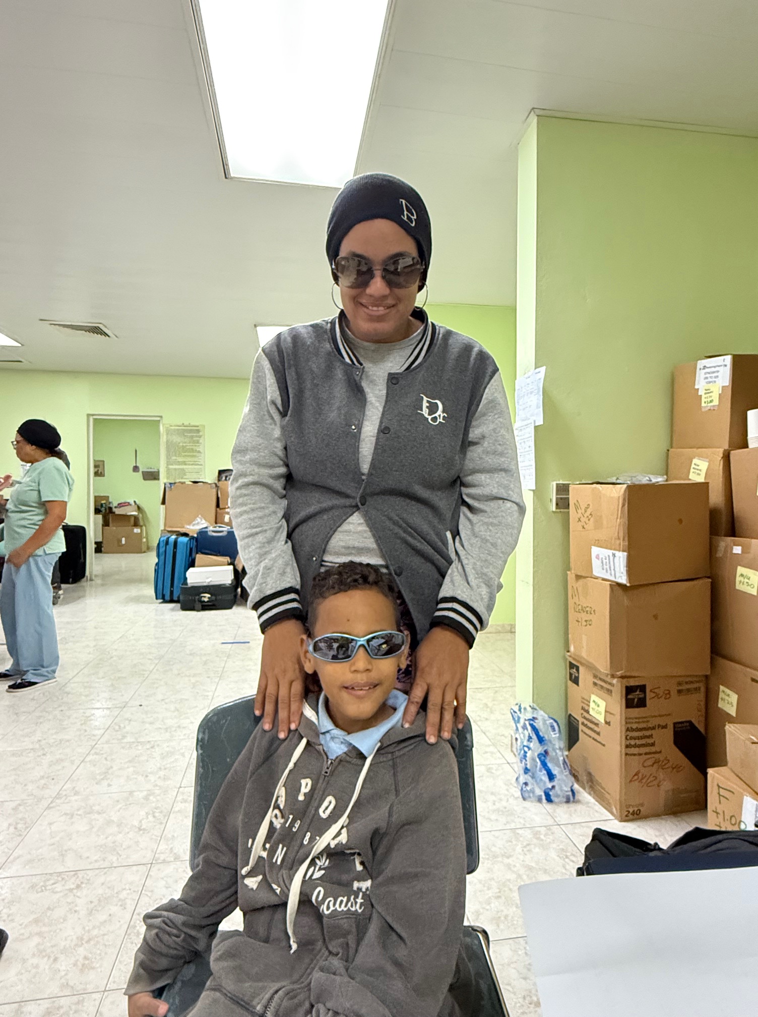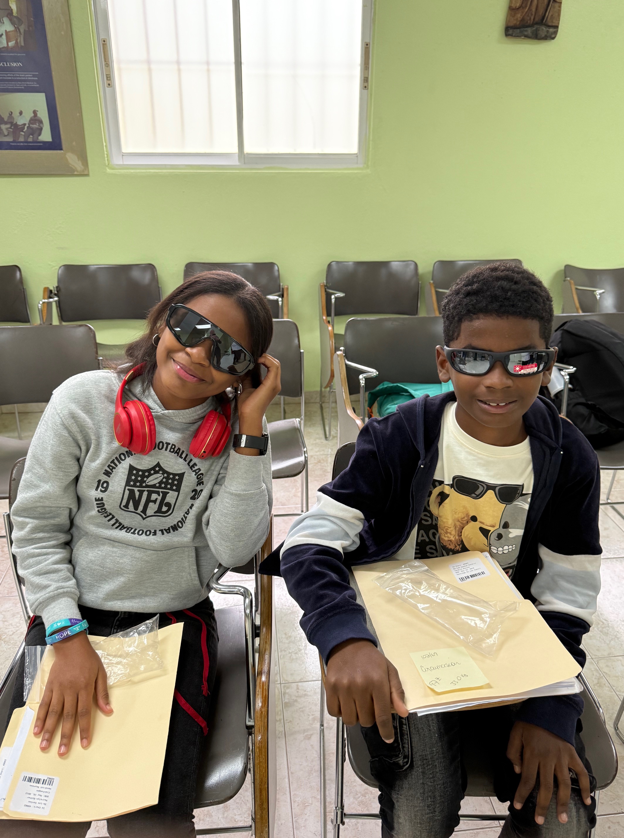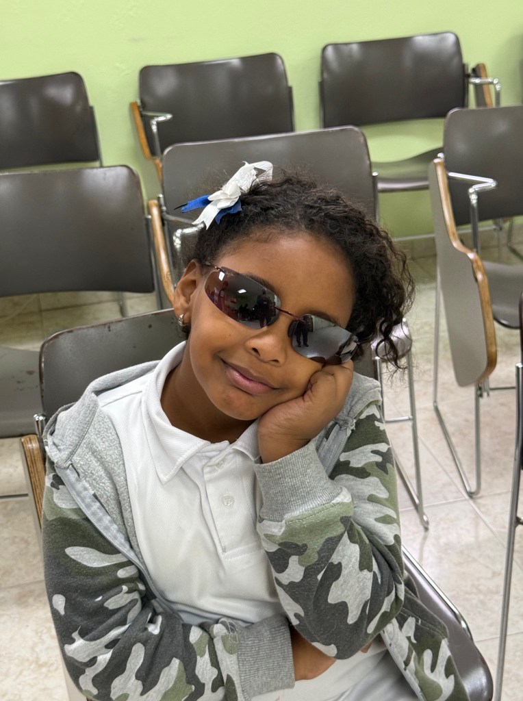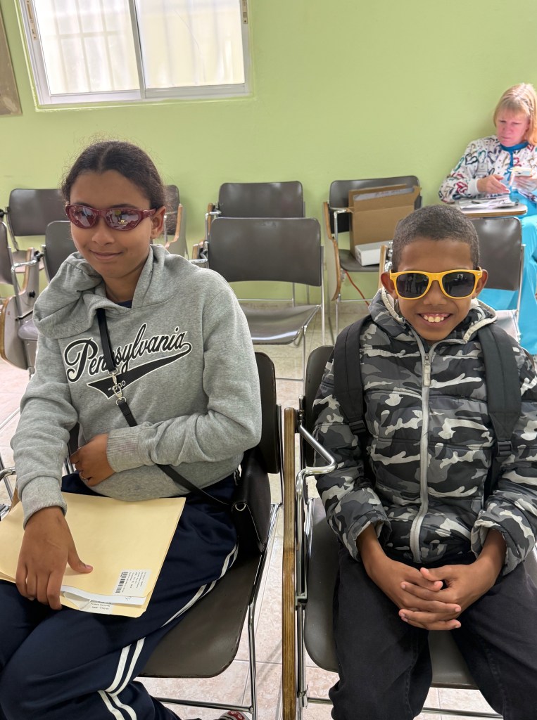 This year we saw 1,077 patients, a bit below our peak of 1,200 two years ago. Our team is made up of Dominicans and Americans from all over the U.S., including Peace Corps volunteers (three this year) who are most helpful with translation. My work is mostly sherpa-like, do what is needed, but like in past years I was assigned to the sunglasses station. Everyone in Santiago and all of the Dominican Republic needs sunglasses and we have generous donors who supply some of the best products in the market. My job is simple: let patients choose glasses that they like and fit. At the orphanage, my role changed. There I was responsible for acuity, that is having kids read shapes at 20 feet (although given space limitations the children and staff were reading at 10 feet). From there, conversion, e.g. 20/20 occurs, which is recorded in the patient file. Of course, one of the measures of success is smiles, at least in regard to sunglasses.